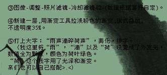 | 3、选择菜单:图像 > 调整 > 照片滤镜 > 冷却滤镜82(数值根据自己喜好设定)。 4、新建一层,用渐变工具拉浅粉色的渐变,然后把图层混合模式改为“叠加”,图层不透明度改为:35%。 5、打上自己喜欢的签名文字。 6、拖入荷花素材,图层混合模式改为“正片叠底”。 |