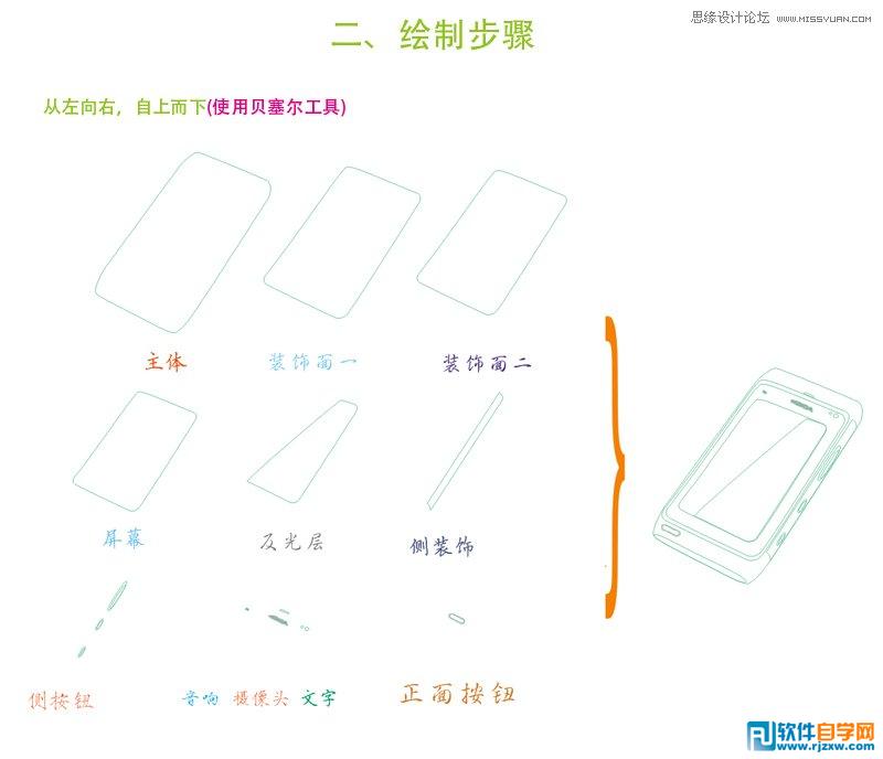 这些很简单吧,就是用贝塞尔曲线做的,在PS里就是钢笔工具!这里要做说明的是:在画正面按钮和文字时,要注意透视,在效果工具栏里有添加透视的命令!还有侧面的按钮时椭圆套的。