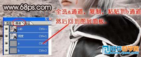 | 1、打开原图,按Ctrl + J把背景图层复制一层,选择菜单:图像 > 模式 > Lab颜色,确定后点通道面板,选择a通道,按Ctrl + A全选,按Ctrl + C复制,点蓝色通道按Ctrl + V粘贴。 |