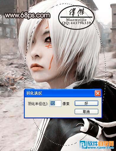 | 3、按Ctrl+j把锐化后的图层复制一层,图层模式改为柔光,图层不透明度为70%,接着再按Ctrl+j复制一层,用椭圆工具选取如下图所示的椭圆,按Ctrl+Alt+D羽化,羽化半径为70,接着按Delete删除,图层模式为正片叠底,不透明度为100%。完成后,再一次按Ctrl+j复制一层。 |