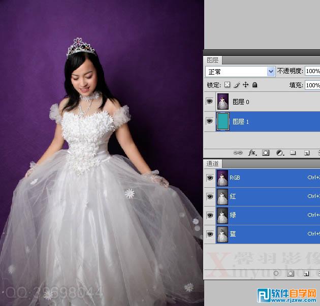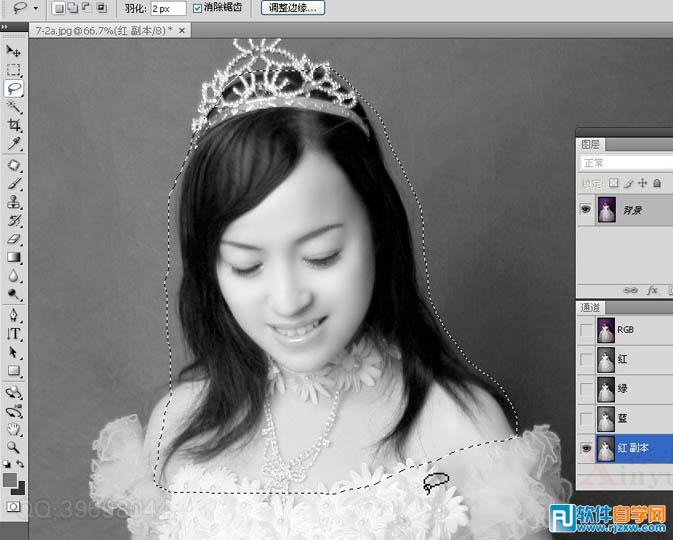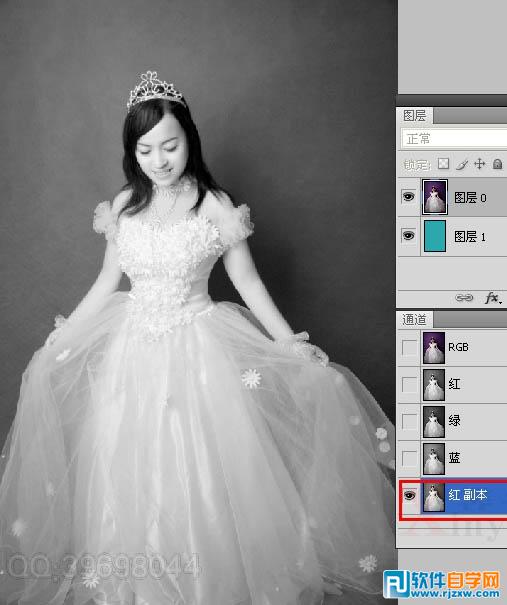 | 2、将通道调板打开,对比RGB三个通道,感觉红通道和背景对比较强,复制红通道为红副本通道,如图02所示。如果直接用色阶命令调整明暗度的话黑色的头发就要被忽略,因为头发的颜色和背景太相近了,没关系,我们只要把黑色的头发变为白色问题不就迎刃而解了吗。 |