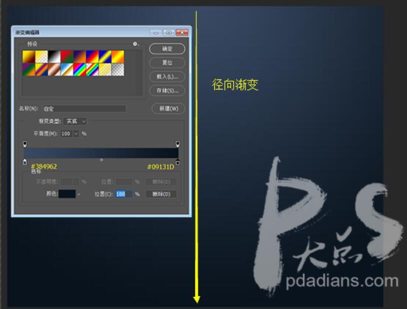 使用径向渐变,做一个颜色为#384962和#09131D的渐变背景。