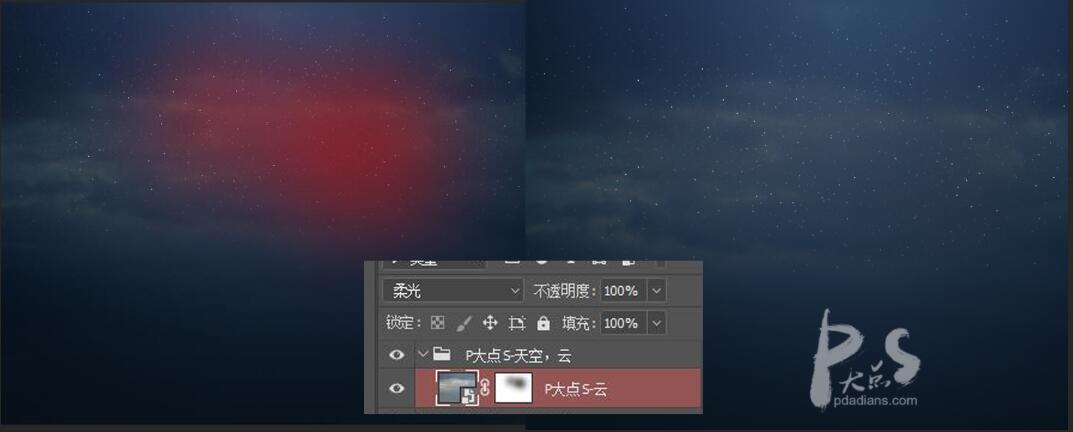 置入“天空云”素材,并将图层模式改为柔光,降低画笔透明度为50%,为云素材添加蒙版。