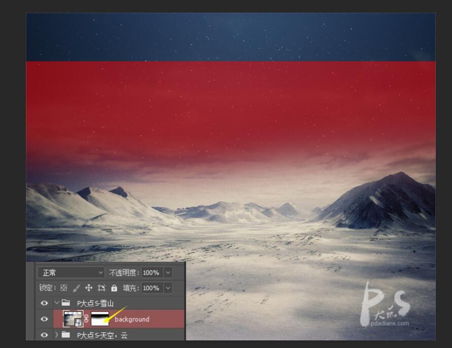 置入“雪山.jpg”素材,使用柔角画笔为该图层添加蒙版。(为了直观,蒙版在图中我们以红色显示)