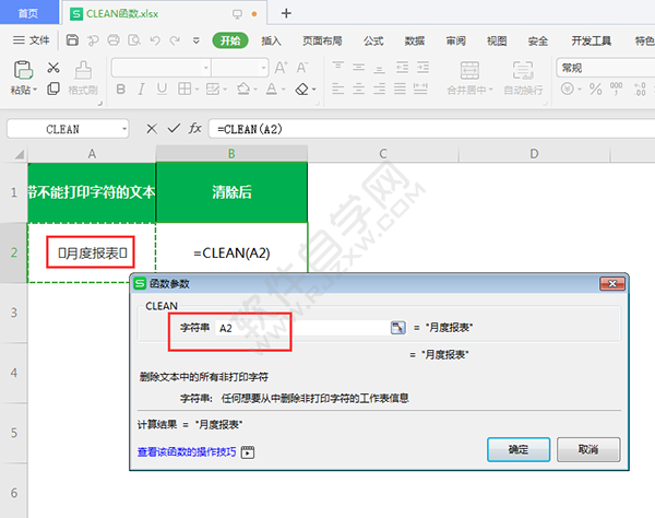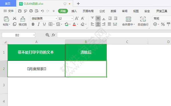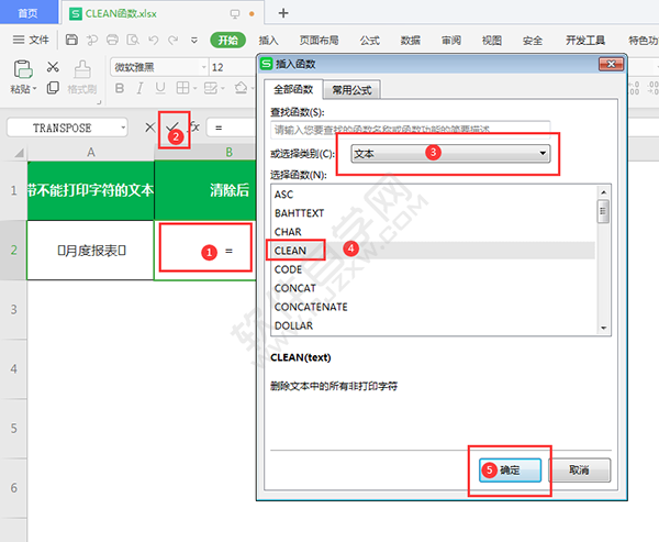 2、点击单元格,点击插入函数,点击文本,输入CLEAN函数。
