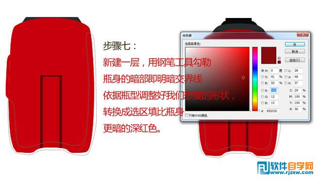 | 7、新建一层,用钢笔工具勾勒瓶身的暗部及明暗交界线,依据瓶型调整好我们想要的形状,转换成选区填充比瓶身更暗的深红色。 |