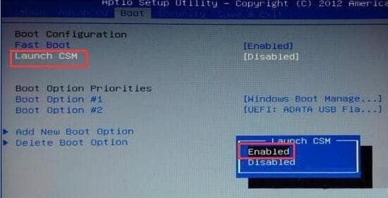 3、然后在Boot设置中找到Launch CSM选项,将其设置为Enabled这是将兼容模式打开。
