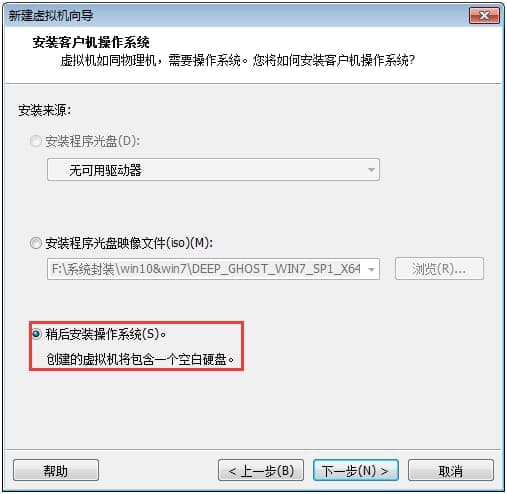 在这里点击浏览,将我们下载好的虚拟机专用win7系统iso镜像系统添加进去,然后选择第三个“稍后安装操作系统”点击下一步继续操作。