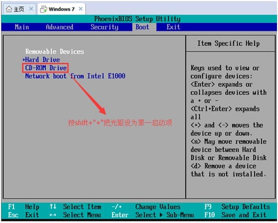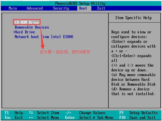 然后找到"CD-ROM drive",使用”+“号键将它的位置调整到第一个上面来。