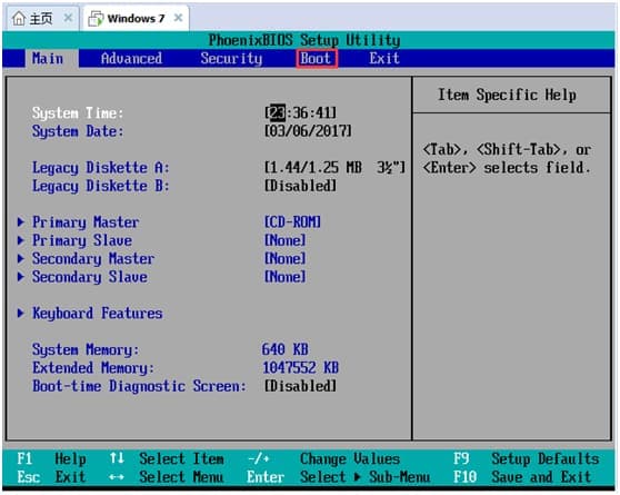 稍后我们就进入到BIOS设置界面,在这里我们使用键盘上来操作,使用方向键将光标移动到第四个选项”boot“上面来。