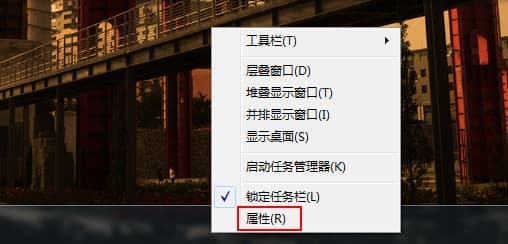 1、右键打开win7系统任务栏,选择弹出菜单的“属性”,如下图所示: