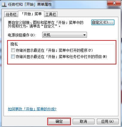 2、在打开的开始的“任务栏和开始菜单属性”对话框里将“存储并显示最近在开始菜单中打开的程序”和“存储并显示最近在开始菜单和任务栏中打开的项目”前面的钩子去掉,点击“确定”按钮,如下图所示: