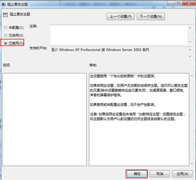 3、在打开阻止更改主题设置窗口中,点击“已禁用”,随后点击“确定”按钮即可,如下图所示: