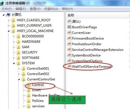 选中Ccontrol选项,在右边窗口找到“WaitToKillServiceTimeOut”,如图;