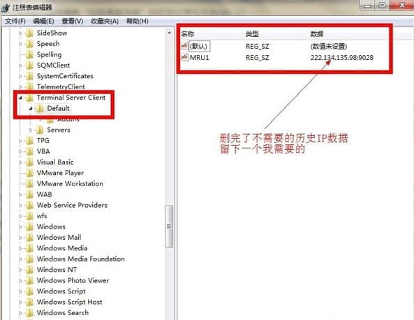 假如用远程桌面连接过数台计算机,则在右边的窗格中将会有多个字符串值,例如MRU0、MRU1、MRU2等,这些字符串的数值数据就是连接的IP地址和端口。