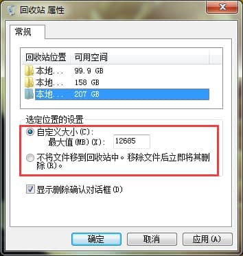 2.可以看到win8系统的回收站属性窗口了,在打开的窗口中,咱们看到下面有一个自定义大小的设置,这里表示的就是咱们回收站容量大小的设置了,大家根据自己的需求进行设置即可,设置完成之后,点击确定保存即可。