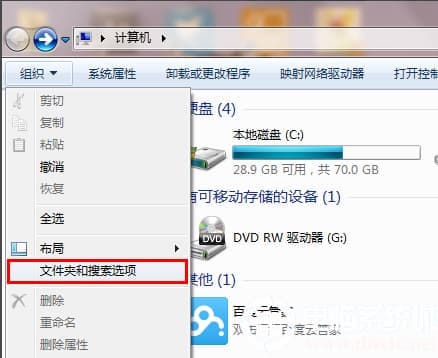 2.然后在出现的界面左上角点击组织,选择文件夹和搜索选项打开,如下图所示;