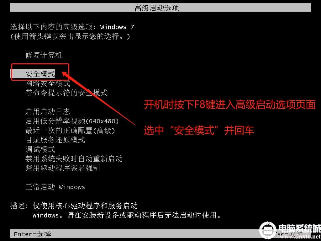 1.重启电脑。在开机界面出现后猛戳“F8”进入高级启动界面,选择“安全模式”进入。