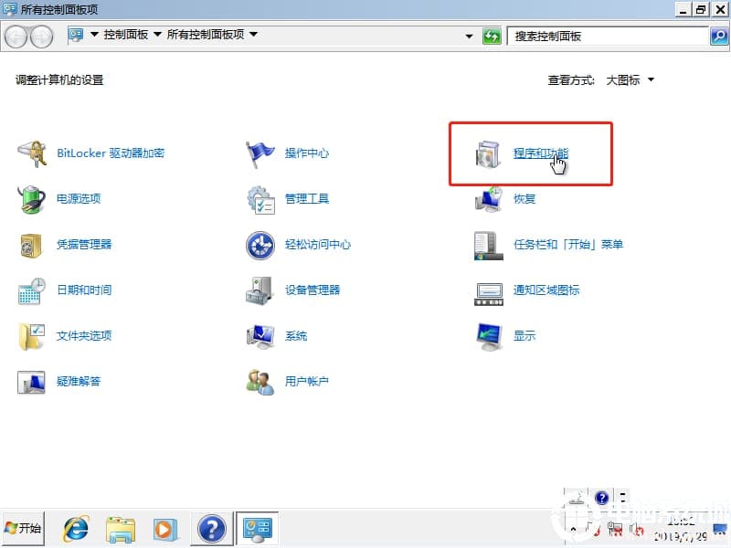 3.随后在打开的控制面板界面中将查看方式改为“大图标”,选择其中的“程序和功能”选项。