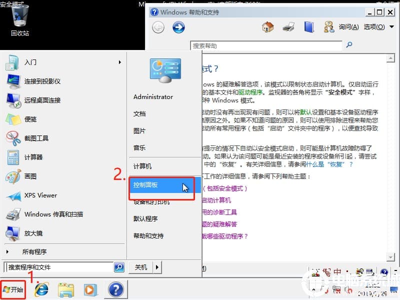 2.在安全模式界面中点击“开始菜单”,随后选择“控制面板”进入。