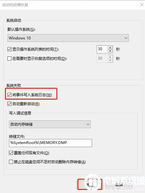 如果是win10系统的话,我们就需要右键点击“计算机”并选择“属性”,点击“高级系统设置”下的“启动和故障恢复”,选择“设置”,依旧勾选“将事件写入系统日志”复选框,最后点击“确定”即可。