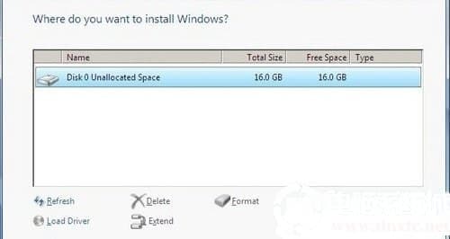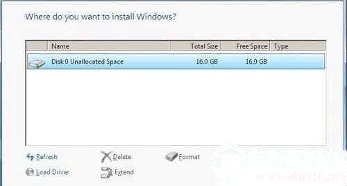 事实上,当出现图2所示的界面时,并非是说Windows7安装程序有问题,也并不是就意味着硬盘本身有问题。点击上图中的“DriverOptions(advanced)”按钮后,Windows 7安装程序会让用户新建分区(如图3,请注意对比图2和图3的不同)。