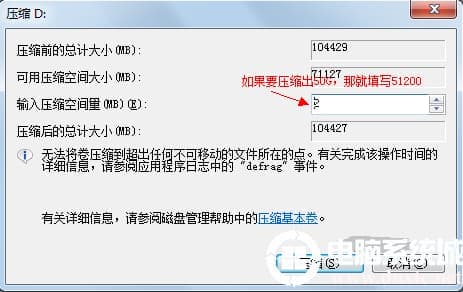 6、在输入压缩空间量(MB)里填写要压缩出的空间量,如果要压缩出50G,就填写50G*1024MB。