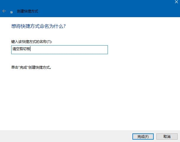 3、在键入该快捷方式的名称下方的框中输入清空剪贴板,点击完成;