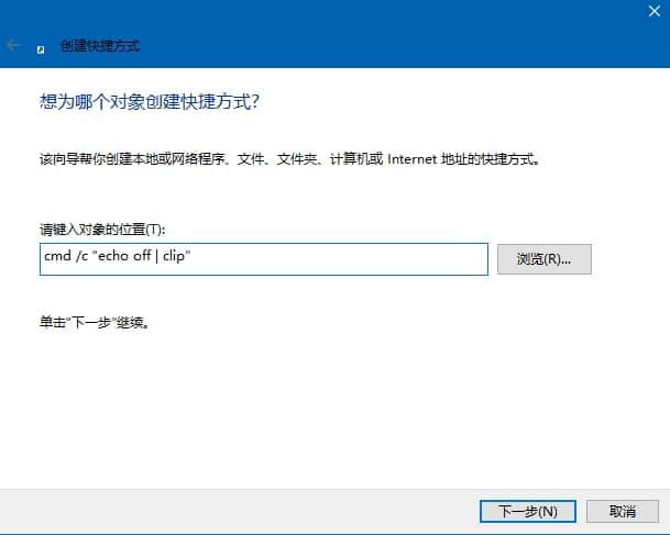 2、在请键入对象的位置下方的框中输入cmd /c “echo off | clip”,点击下一步;