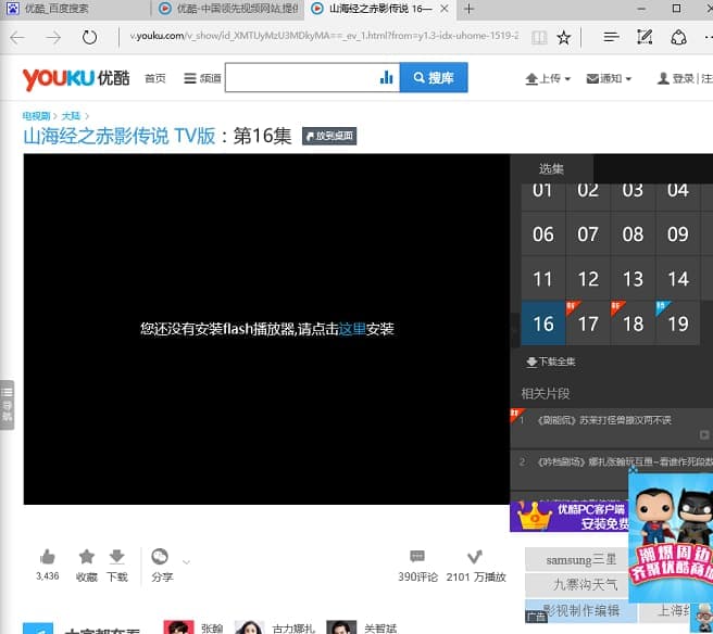 8.打开一个优酷的视频可以发现会显示以下的画面。打开”收藏夹“,打开刚刚收藏的链接,视频就会以html5形式播放,并且是无广告的。