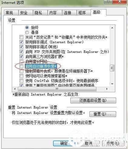 解决方案:工具-internet选项-高级中关闭 【启用崩溃自动恢复】 重启ie后即可。