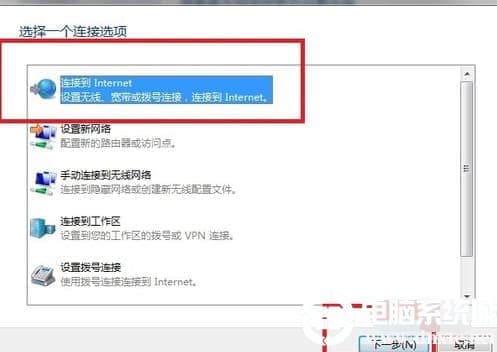 6,在打开的菜单里点击“连接到internet”点击下一步继续到最后我们就建立好新的连接了。如果点击下一步有很多连接供你选择的话请点击“宽带连接”选项,再下一步就好了。