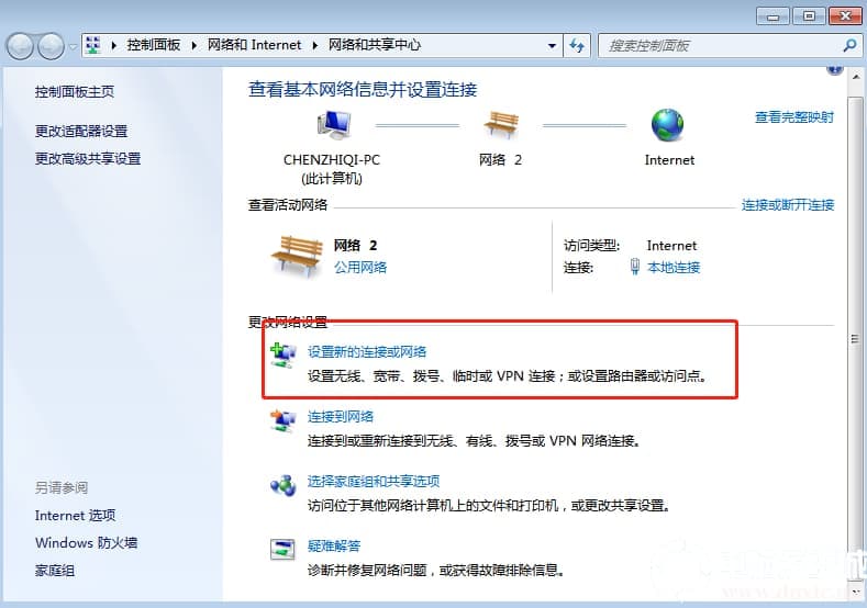 2.在打开的网络和共享中心界面中点击“设置新的连接或网络”,如图所示: