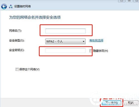 5.此时我们开始设置需要共享的网络名称以及安全秘钥,随后点击“下一步”。