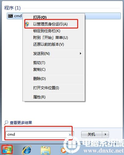 1.点击“开始菜单”图标,随即在弹出的搜索框中输入“cmd”命令,右键选中后点击“以管理员身份运行”。