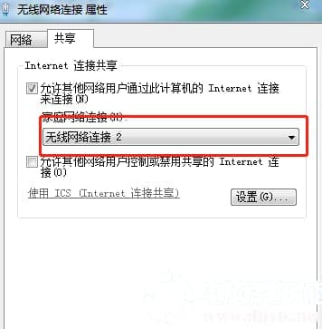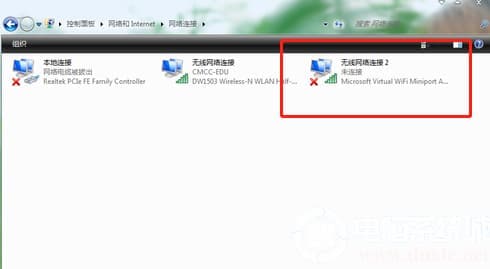 其中mode=allow是指启用虚拟wifi网卡,如果不启用则改为“disallow”,ssid后为无线网络的名称,key即为密码。此时开始打开网络共享中心,点击“更改适配器”后选中“无线网络连接2”(win7自带的虚拟wifi网卡)。