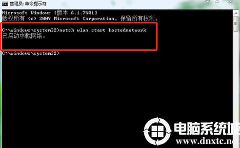 4.再次打开命令提示符,输入“netsh wlan start hostednetwork”命令启动承载网络,我们就可以使用其他设备连接此网络了。