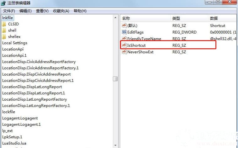 2.在打开的注册表编辑器界面中找到“HKEY_CLASSES_ROOT”中的“lnkfile”,右键选中“isshortcut”并删除,随即重启计算机即可生效。
