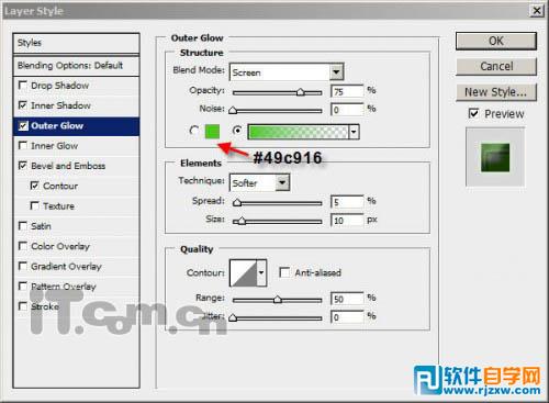| 外发光 :渐变颜色#49c916,扩展5%,大小10px。 |