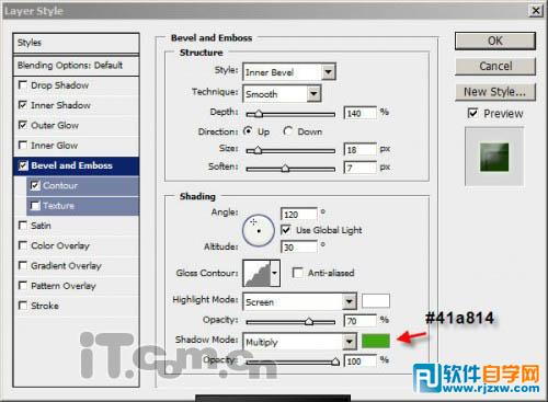 | 斜面和浮雕 :深度140%,大小18px,软化7px,光泽等高线为“圆形台阶”,阴影模式的颜色为#41a814。 |