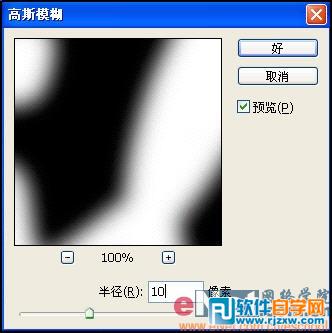 | 3、将文字进行栅格化处理,按Ctrl键单击文字图层,调出选区,然后将文字层隐藏。切换到通道面板,单击底部的“将选区存储为通道”按钮,将选区保存为通道Alpha 1,选择Alpha 1为当前通道,取消选区。 4、执行菜单栏中的“滤镜”“模糊”“高斯模糊”命令,在弹出的对话框中设置参数为10,如图02所示,画面效果如图03所示。 |