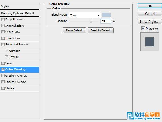 | 第3步、通过双击图层面板或者在图层面板右键单击进入图层的混合选项,选择颜色叠加。其中混合模式为颜色,颜色设置为#b9ccdd,透明度为75%。如下图所示。 |