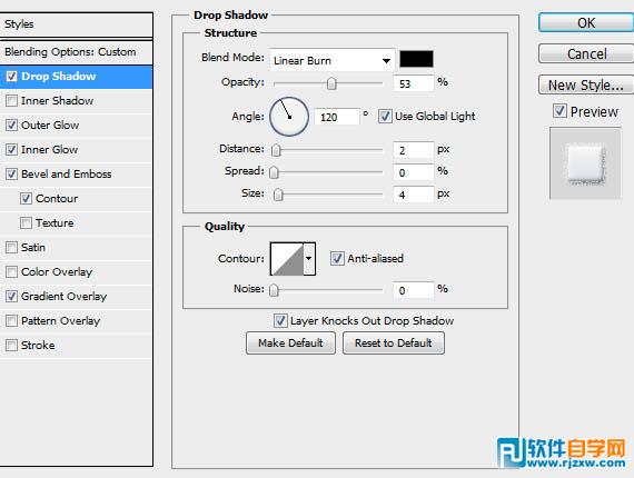 | 第5步、对您刚刚创建的形状进行如下设置。如果你想节省一些时间,你也可以直接用素材包中的白雪样式。使用方法是先安装样式包,在混合选项面板上方找到样式,选择白雪样式,点击确定即可。 选择投影,混合模式:线性加深,不透明度:75%,距离:2,大小:4,勾选消除锯齿。 |