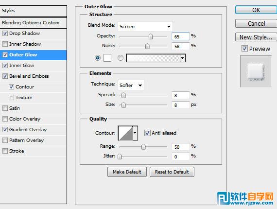 | 第6步、选择外发光,混合模式:滤色,不透明度:65%,杂色:58%,填充色为白色,方法:柔和,扩展:8%,大小:5像素,勾选消除锯齿,范围:50%,抖动:0%。 |