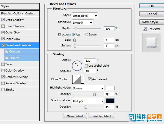 | 第8步、选择斜面和浮雕,样式:内斜面,方法:平滑,深度:100%,方向:上,大小:5像素,软化:1像素,角度:120°,高度:30°,勾选取消锯齿,取消全局光,高光模式:滤色,不透明度:75%,阴影模式:正片叠底,不透明度:45%。 |