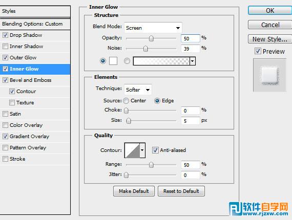 | 第7步、选择内发光,混合模式:滤色,不透明度:50%,杂色:39%,方法:柔和,源选择边缘,大小:5像素,勾选消除锯齿,范围:50%,抖动:0%。 |