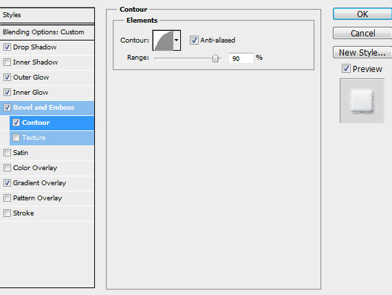 | 第9步、选择等高线,等高线:半圆,勾选消除锯齿,不透明度:90%。 |