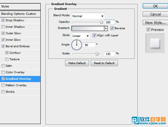 | 第10步、选择渐变叠加,渐变色为#d3d8de到白色,样式:线性,与图层对齐,反向,角度:90°,缩放:130%。 |