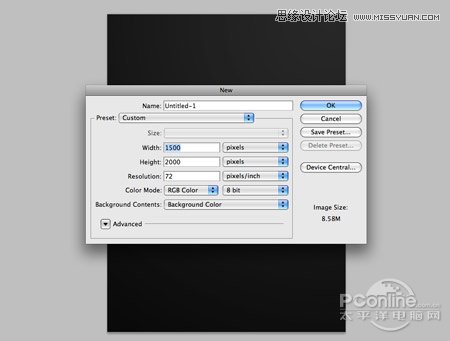 1、打开Photoshop,根据需要新建画布,尺寸为1500px*2000px,分辨率为72dpi,填充背景为暗灰色。设置如下图所示。