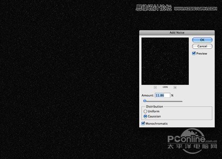 6、新建一个图层,按shift+F5填充黑色,然后执行“滤镜>杂色>添加杂色”,设置数量约10%,勾选高斯分布和单色,完成后设置图层混合模式为滤色,按Ctrl+L调整色阶,令画面呈现的白色点点。
